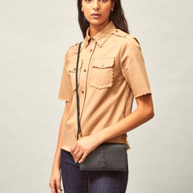 - لمزيد من الرقي والجمال ، الحقيبة مصنوعة من الجلد الناعم مع شعار توري بورش باللون الأسود وحزام كروس مزين بسلسلة ذهبية.