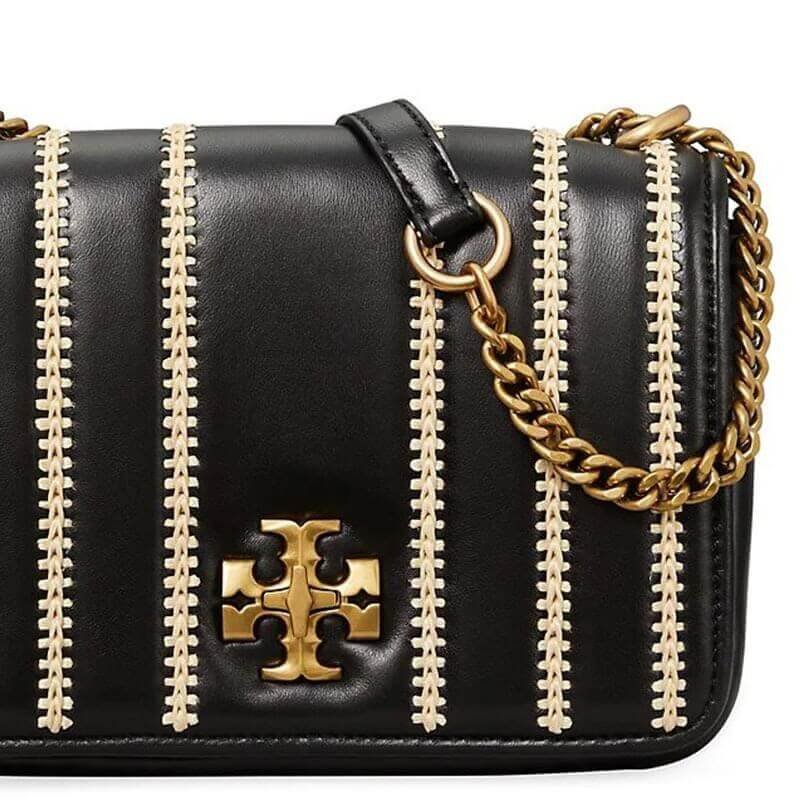 حقيبة كتف كيرا من توري بورش مزينة بخطوط الرافية ، وهي مصنوعة من الجلد الناعم ، تم الانتهاء من هذه القطعة الأنيقة بأجزاء T مزدوجة وحزام سلسلة ذهبي اللون.