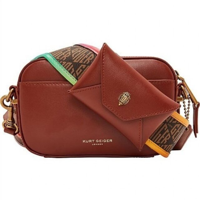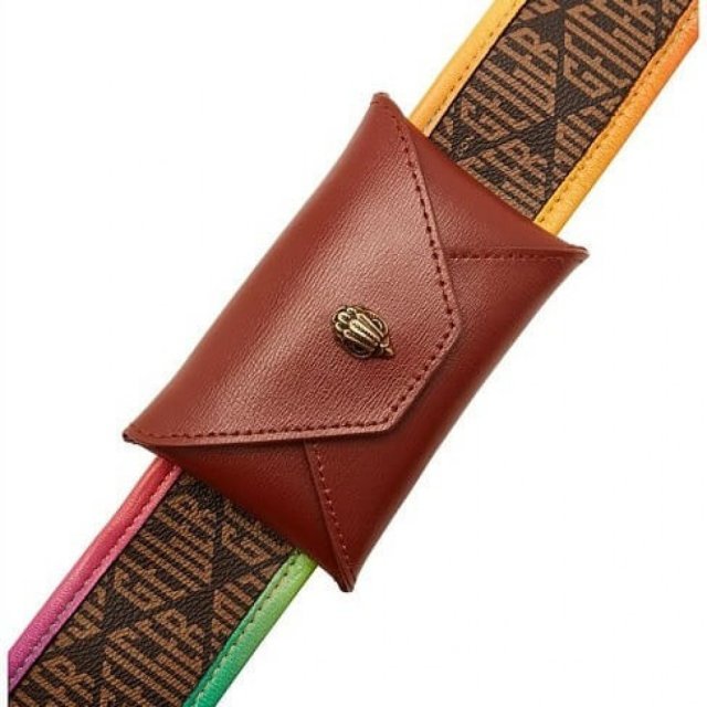 - حزام الجسم باسلوب عريض مع شعار الماركة و حافة ملون بالوان قوس قزح ومحفظة صغيرة الحجم مع شعار رأس نسر صغير باللون الذهبي
