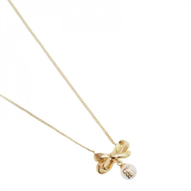 - العقد مزين بدلايه على شكل فيونكه مرصعة مع اللؤلؤ الأبيض الصناعي مع شعار كارولينا هريرا الذهبي